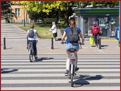3) Czy ta rowerzystka ma obowiązek zejść z roweru i przeprowadzić go przez jezdnię? (pyt. 216)