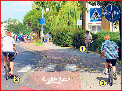 7) Czy tutaj rowerzysta który jedzie drogą rowerową, ma pierwszeństwo przed pieszym?