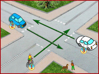 2) Czy w tej sytuacji rowerzysta ma pierwszeństwo przed pojazdem nr 3? (pyt. 368)