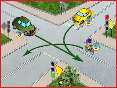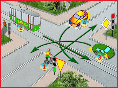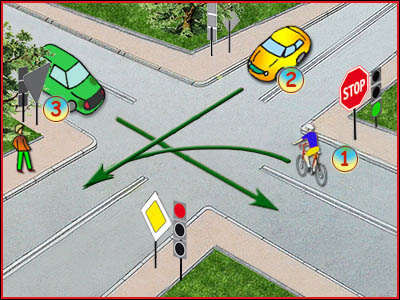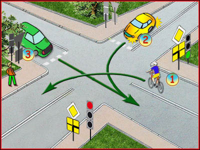 6) Czy rowerzysta na tym skrzyżowaniu pojedzie jako drugi? (pyt. 415)