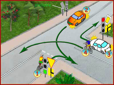 Nie. Przecież rowerzysta nr 4 ma czerwone światło. Kolejność to: 1-2-3 i 4