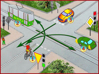 3) Czy w tej sytuacji rowerzysta pojedzie dopiero jako drugi? (pyt. 424)
