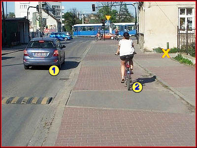 8) Czy kierujący pojazdem nr. 1, który chce zaparkować w miejscu oznaczonym żółtym X, ma pierwszeństwo przed rowerzystką? (pyt. 668)