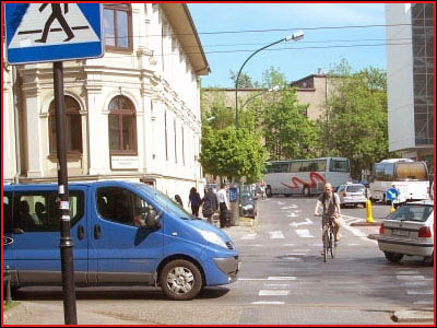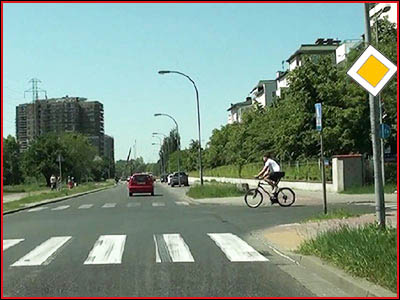 5) Czy rowerzysta jadący przez jezdnię przejazdem dla rowerzystów, włącza się do ruchu? (pyt. 683)