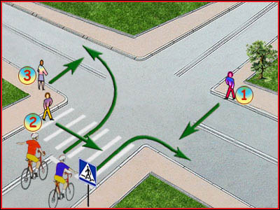 9) Czy rowerzysta który skręca tutaj w lewo, musi ustąpić pierwszeństwa pieszym 2 i 3? (pyt. 686)