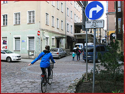 4) Czy temu rowerzyście wolno tak wjechać na drogę jednokierunkową, od strony zakazu wjazdu? (pyt. 690)