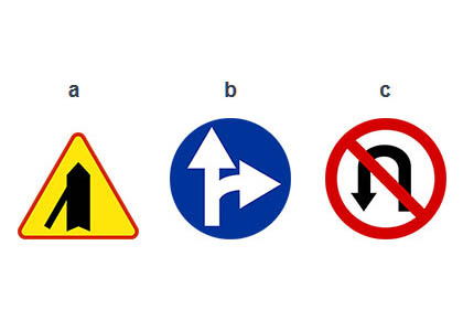 2) Czy znakiem przy którym nie wolno skręcić w prawo, jest znak oznaczony literą A? (pyt. 593)