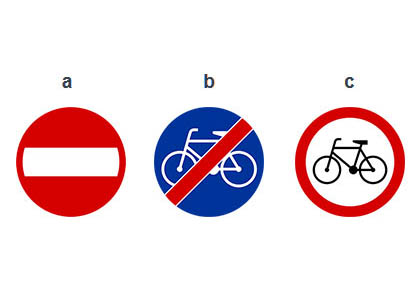 5) Czy znakiem który nie zabrania dalszej jazdy rowerem, jest znak z literą B? (pyt. 585)